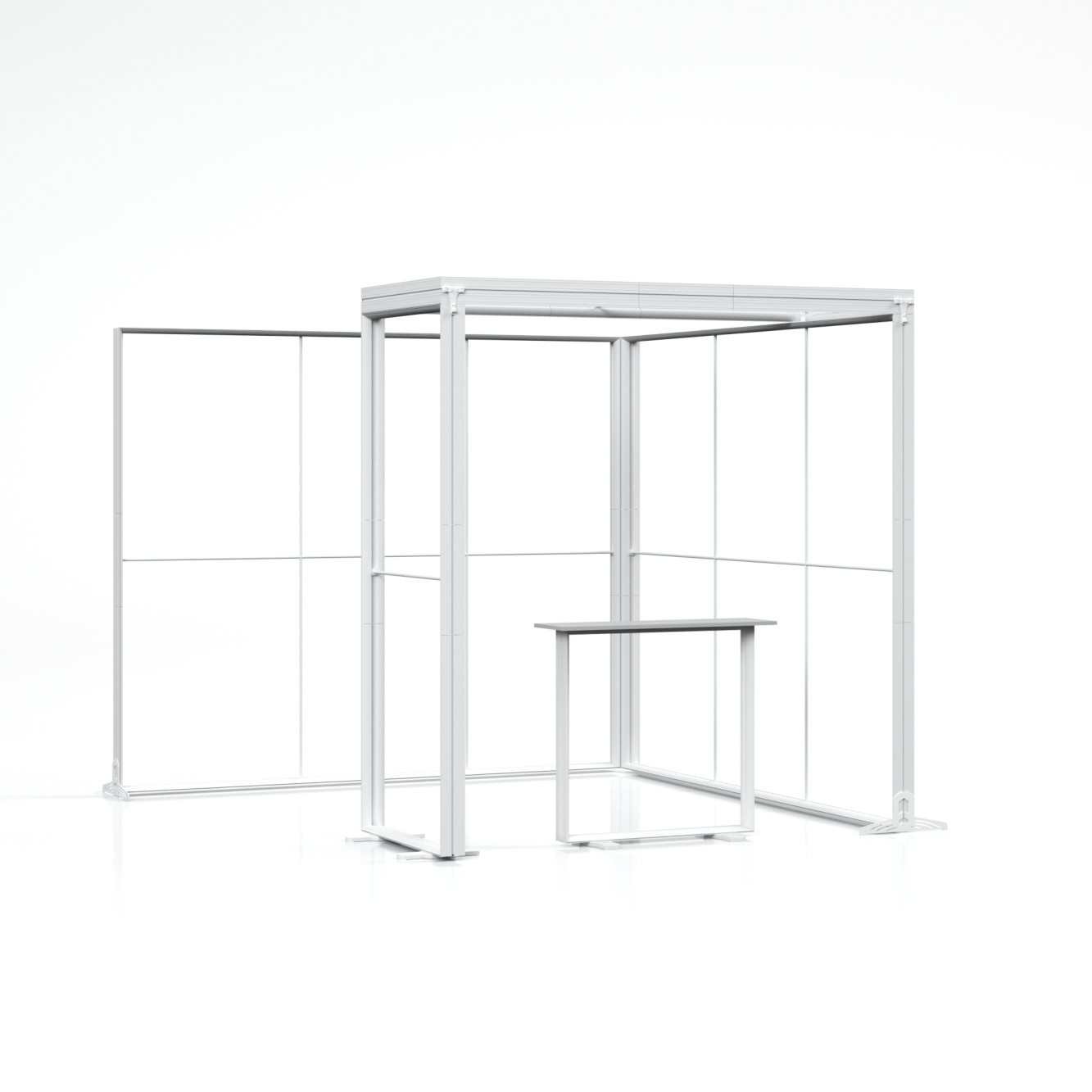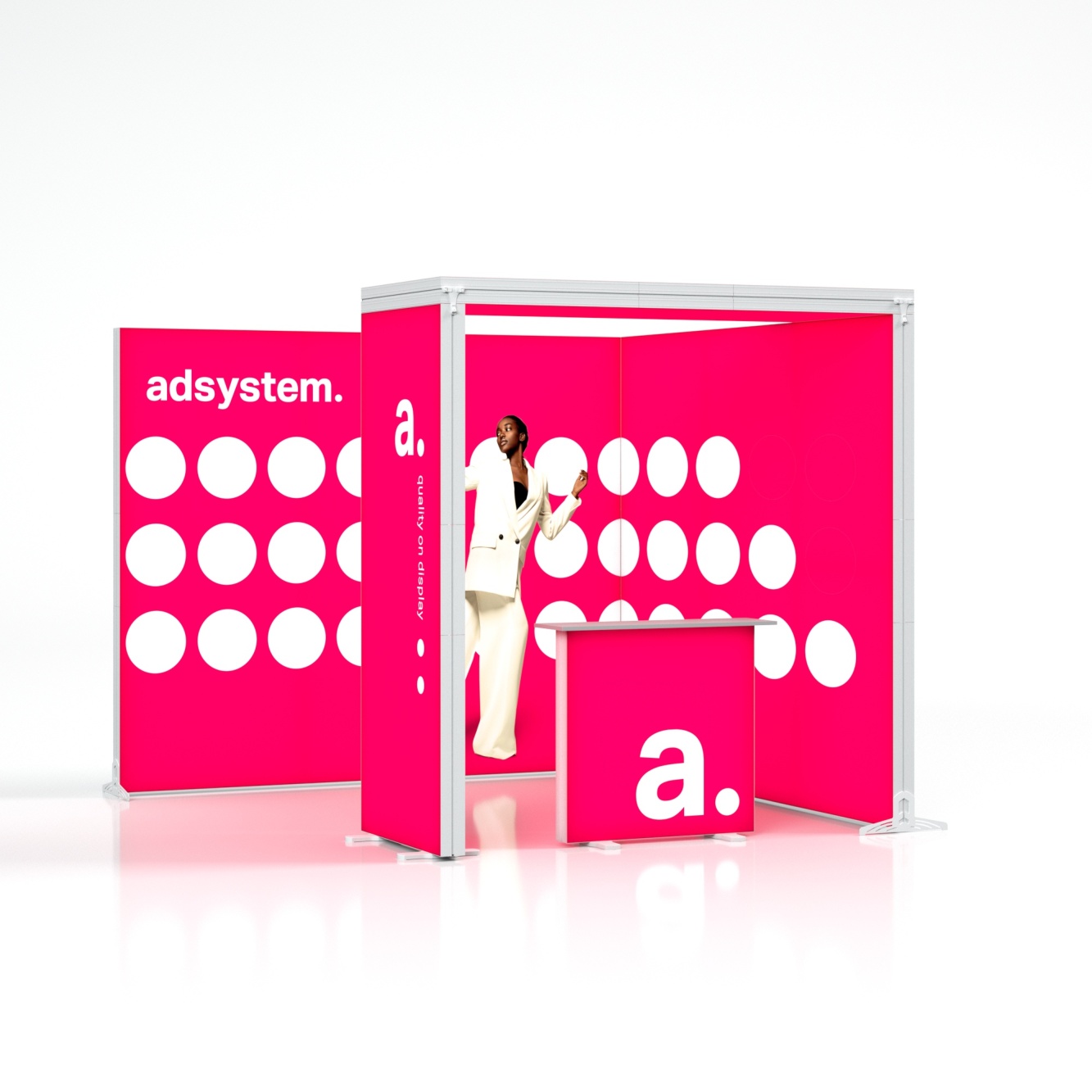 Das adFrame Smart 3x3 L Set zieht durch seine einzigartige Konstruktion mit teilweiser Überdachung die Aufmerksamkeit auf sich. Die L-förmige Anordnung schafft einen halb-offenen Raum für Kundengespräche, während die beleuchteten Lightboxen eine große Werbefläche bieten. Das Set besteht aus vier adFrame Smart Lightboxen und dem adTribune Smart LED SF Counter.