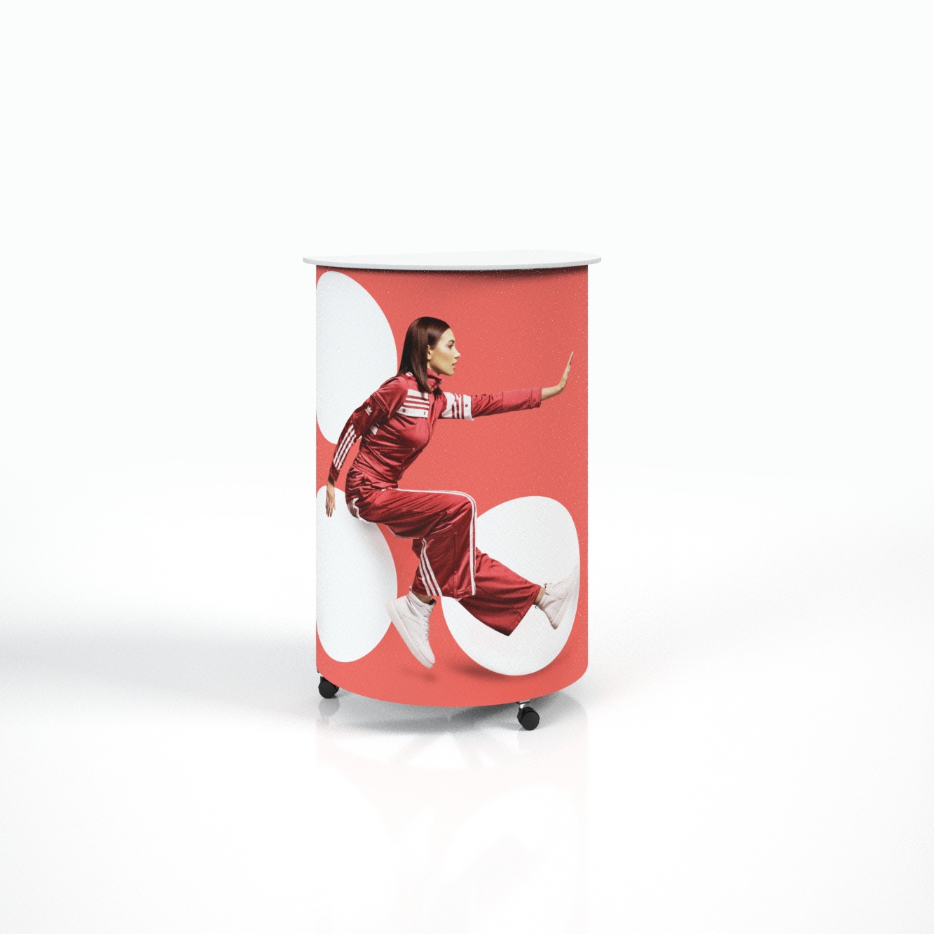 Der adTribune Hit Mini ist ein Ausstellungstresen, der sich durch seine kompakte, rollbare Konstruktion auszeichnet. Dies ist eine praktische und mobile Lösung, die sich hervorragend für Promotionen und Verkostungen eignet, selbst an Orten mit begrenztem Raum.