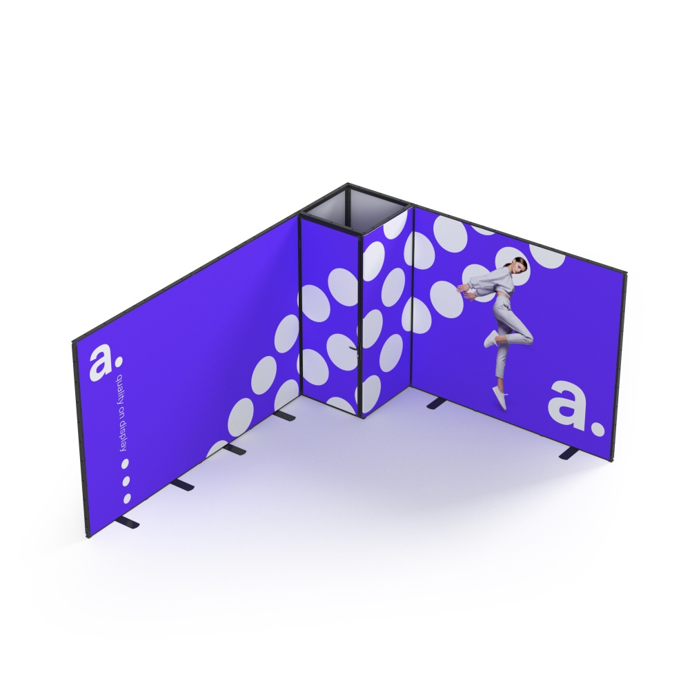 Module in den Größen 100×250 cm und 50×250 cm ermöglichen verschiedene Konfigurationen – von kleinen Ständen bis zu größeren Messeaufbauten. Auf Wunsch fertigen wir auch höhere Elemente bis zu 350 cm, um deiner Präsentation noch mehr Raum und Charakter zu verleihen.