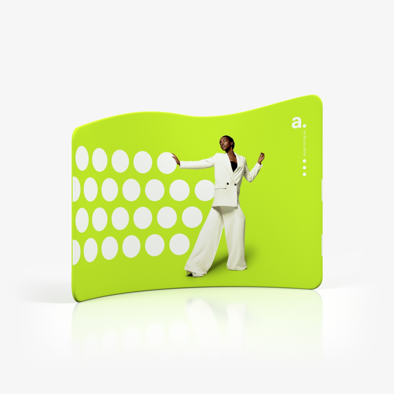 Ausstellungen: Auf Produkt- oder Fachausstellungen definiert das Vario Slope den Präsentationsbereich und schafft einen ästhetischen Hintergrund für ausgestellte Produkte. Es kann als Teil des Standdesigns oder als eigenständiges Werbemedium verwendet werden, das Besucher zum Kennenlernen Ihres Angebots einlädt.