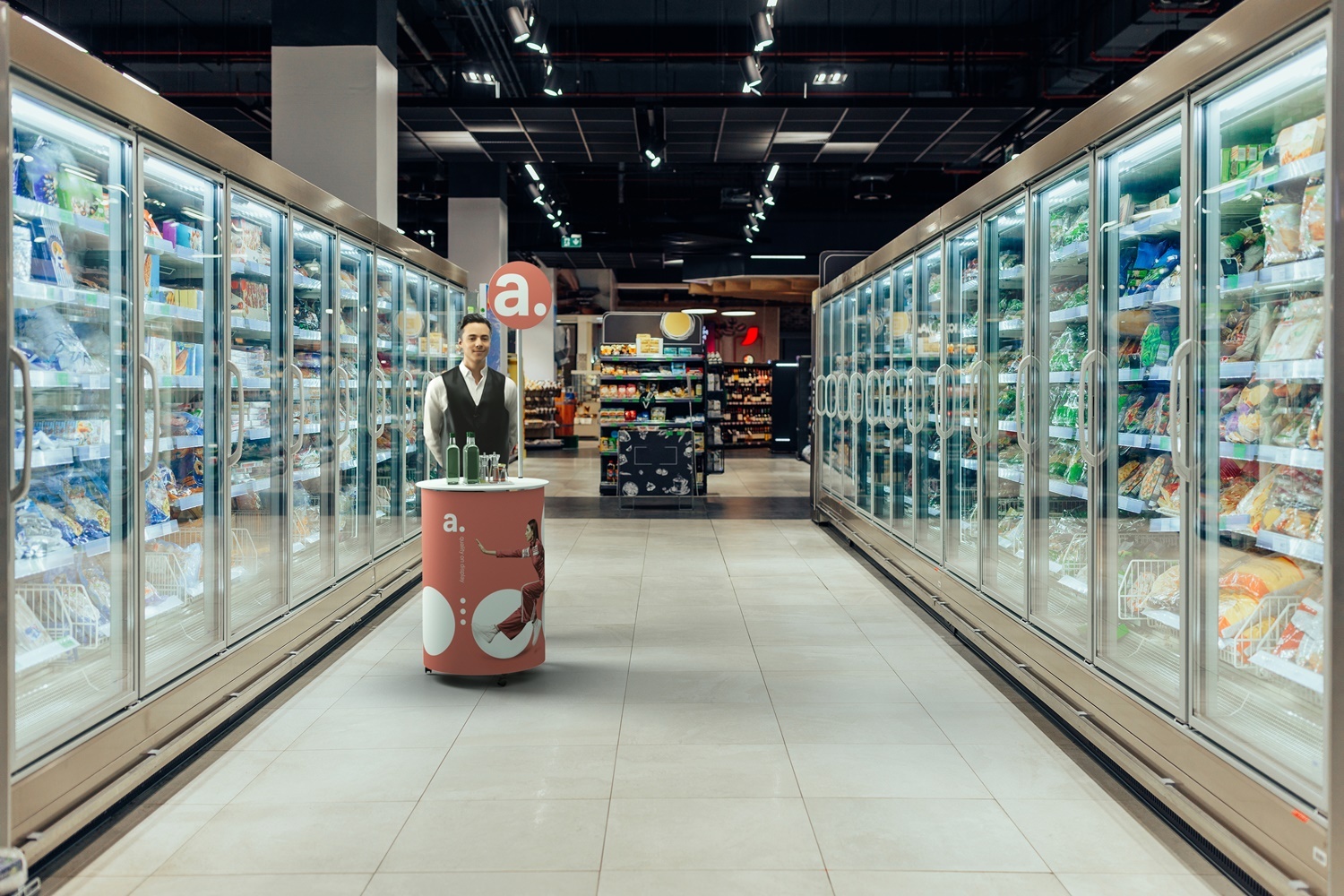 adBox Ring è un elegante tavolo da catering che si distingue per la sua struttura rotonda su ruote. Ideale per promozioni e degustazioni, offre unampia superficie espositiva.