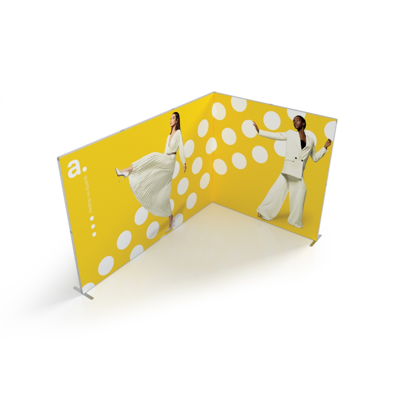 Das Foldable Messe-Set ist ein kostengünstiges Ausstellungssystem, mit dem Sie einen ordentlichen Werbestand für verschiedene Veranstaltungen vorbereiten können. Die Konstruktion der hier vorgeschlagenen Lösungen basiert auf Aluminiummodulen mit den Maßen 100x250 cm, an denen textile Drucke mit personalisierten Grafiken angebracht werden.