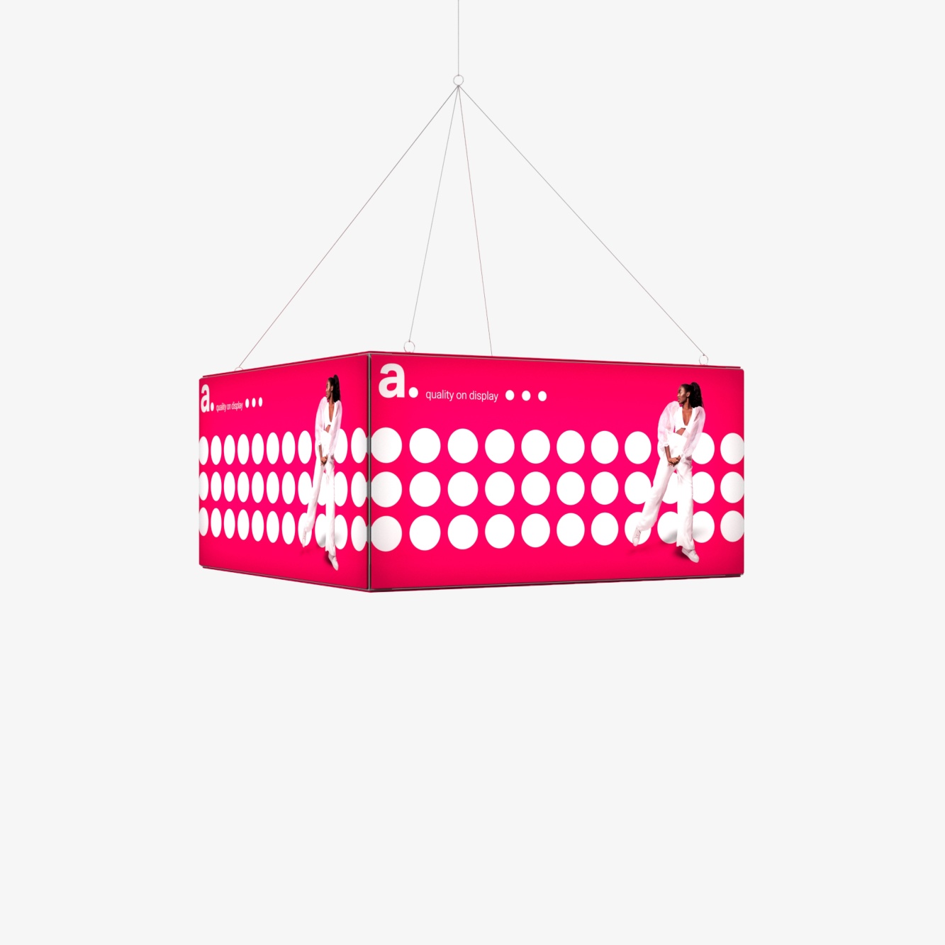 Das adFrame CTF LED ist als hängendes Schild konzipiert, beleuchtet und auf allen Seiten mit Grafiken versehen. Es wird nach den Vorgaben des Kunden maßgeschneidert.