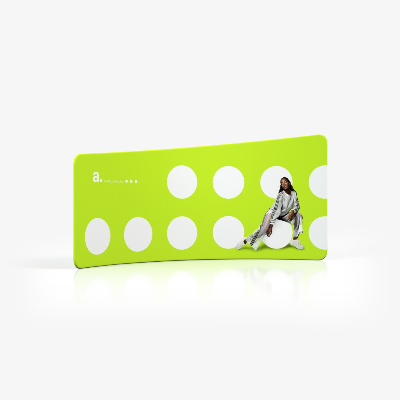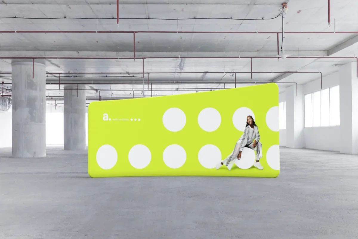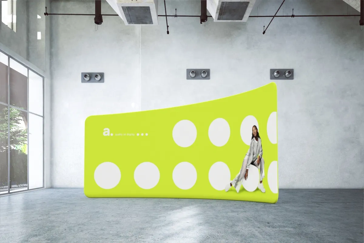 adWall Vario Fall is a photo wall backdrop stand with a subtly curved shape and modern design. Its unique format and large promotional surface make it ideal for showcasing products in various settings.