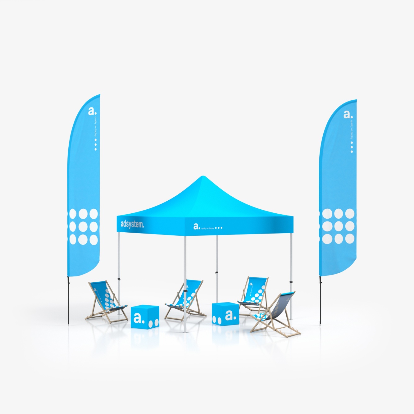 Das Heavy Duty Set für Außenwerbung ist ein Komplettset, das du bei verschiedensten Outdoor-Events einsetzen kannst. Damit kannst du einen Stand für Kundentreffen oder eine Entspannungszone vorbereiten. Dank personalisierter Grafiken, die wir auf den Produkten anbringen, stärkst du deine Werbebotschaft, hebst deine Marke hervor und markierst eindeutig deinen Stand. Als Ergebnis werden Kunden und Besucher deinen Stand schon aus der Ferne erkennen. Das Set umfasst: