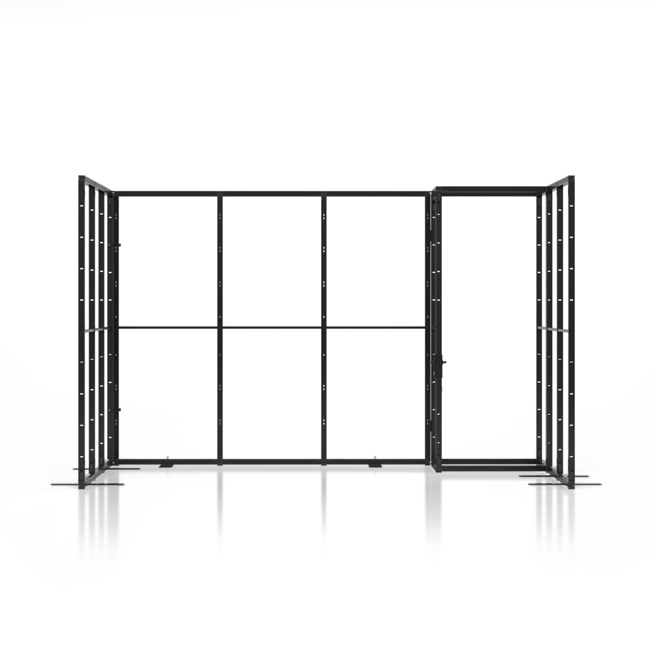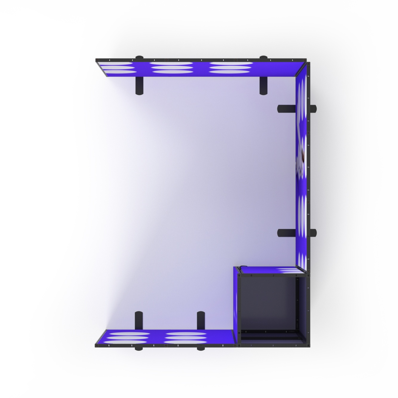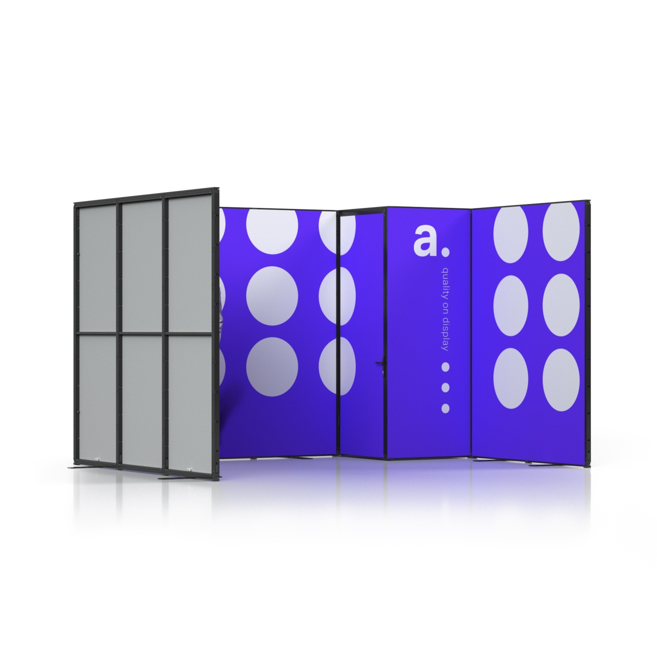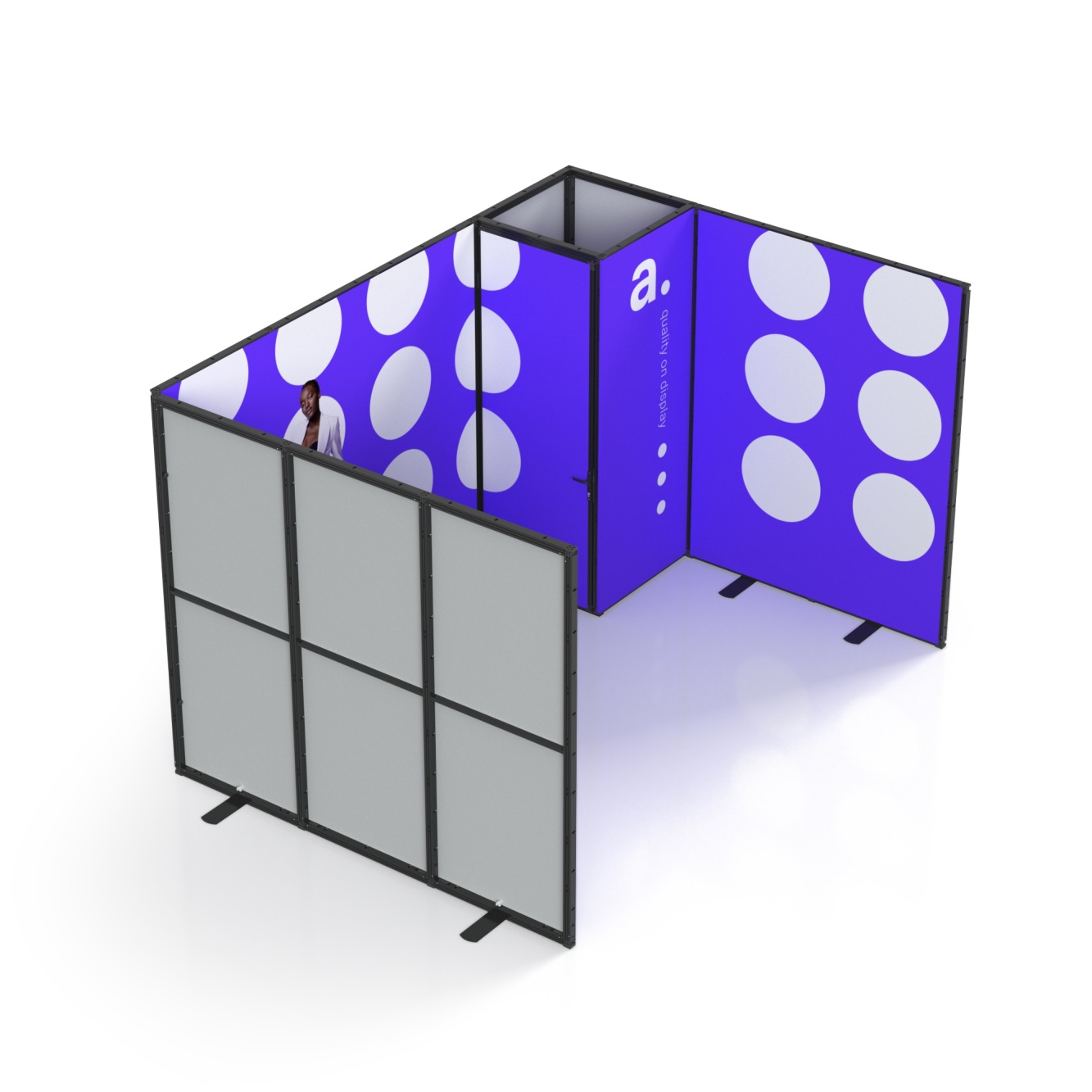 Die Multiframe-Messebaustruktur ist ein tragbares Ausstellungssystem, mit dem Sie einen komfortablen Präsentationsplatz auf Messen vorbereiten können. Dieser Standtyp besteht aus Modulen mit den Maßen 100x250 cm und 50x250 cm. Auf diesen werden Sie textile Drucke mit Ihren personalisierten Grafiken platzieren. Dadurch wird Ihr Messebau Ihre Marke hervorheben, die Aufmerksamkeit der Besucher auf sich ziehen und die Effizienz der durchgeführten Promotion verbessern. Versionen mit einem kleinen Büro sind mit verschließbaren Systemtüren ausgestattet.